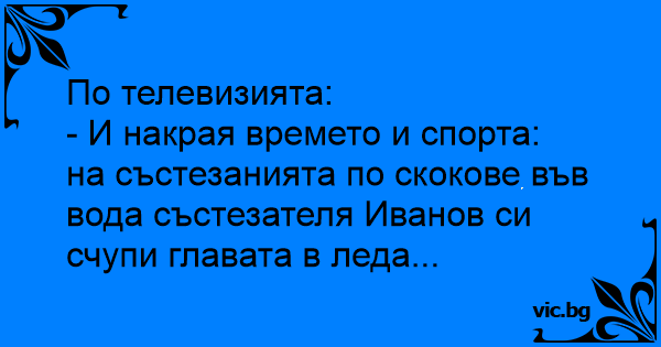на състезанията по скокове във вода състезателя Иванов си счупи главата в леда...