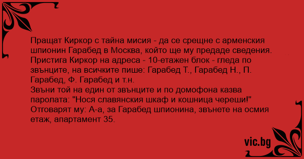 Отговарят му: А-а, за Гарабед шпионина, звънете на осмия етаж, апартамент 35.