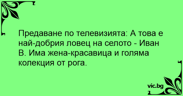Предаване по телевизията: А това е най-добрия ловец на селото - Иван В. Има жена-красавица и голяма колекция от рога.