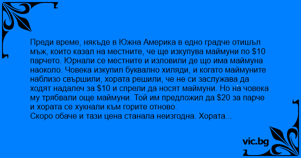 Преди време, някъде в Южна Америка в едно градче отишъл мъж, които казал на местните, че ще изкупува маймуни по $10 парчето. Юрнали се местните и изловили де що има маймуна наоколо. Човека изкупил буквално хиляди, и когато маймуните наблизо свършили, хората решили, че не си заслужава да ходят надалеч за $10 и спрели да носят маймуни. Но на човека му трябвали още маймуни. Той им предложил да $20 за парче и хората се хукнали към горите отново.