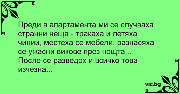 Преди в апартамента ми се случваха странни неща - тракаха и летяха чинии, местеха се мебели, разнасяха се ужасни викове през нощта...