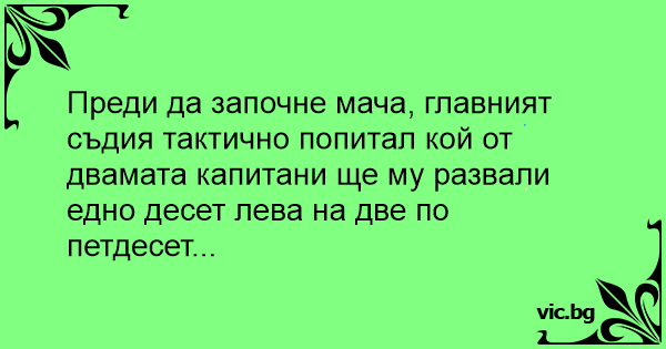 Преди да започне мача, главният съдия тактично попитал кой от двамата капитани ще му развали едно десет лева на две по петдесет...