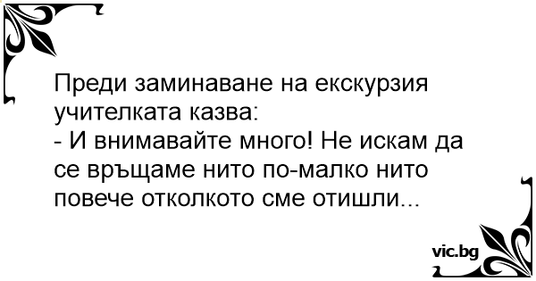 Преди заминаване на екскурзия учителката казва: