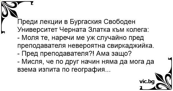 Преди лекции в Бургаския Свободен Университет Черната Златка към колега: