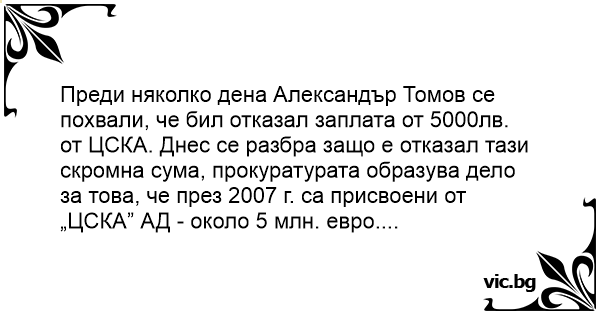 от ЦСКА. Днес се разбра защо е отказал тази скромна сума, прокуратурата образува дело за това, че през 2007 г. са присвоени от „ЦСКА” АД - около 5 млн. евро....