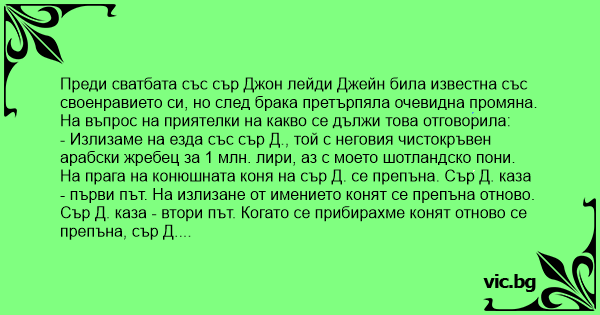 - Излизаме на езда със сър Д., той с неговия чистокръвен арабски жребец за 1 млн. лири, аз с моето шотландско пони. На прага на конюшната коня на сър Д. се препъна. Сър Д. каза - първи път. На излизане от имението конят се препъна отново. Сър Д. каза - втори път. Когато се прибирахме конят отново се препъна, сър Д. каза - трети път - извади револвер и го застреля. Аз го попитах учудено: