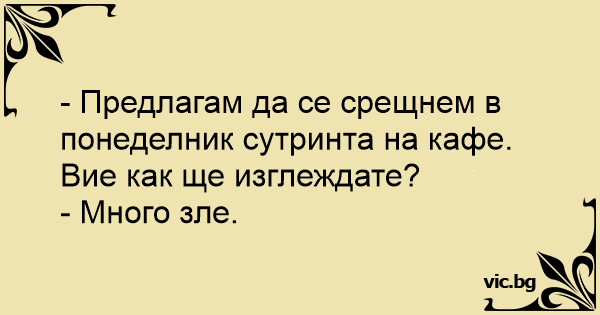 - Предлагам да се срещнем в понеделник сутринта на кафе. Вие как ще изглеждате?