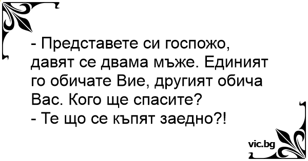 - Представете си госпожо, давят се двама мъже. Единият го обичате Вие, другият обича Вас. Кого ще спасите?