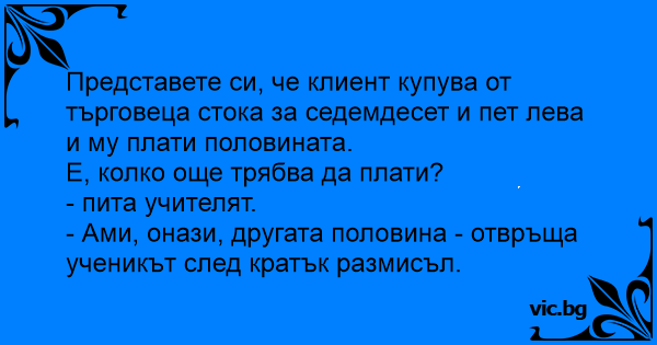 Представете си, че клиент купува от търговеца стока за седемдесет и пет лева и му плати половината.
