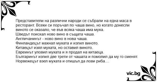 Представители на различни народи се събрали на една маса в ресторант. Всеки си поръчал по чаша вино, но когато донесли виното се оказало, че във всяка чаша има муха.
