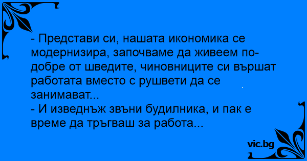 - Представи си, нашата икономика се модернизира, започваме да живеем по-добре от шведите, чиновниците си вършат работата вместо с рушвети да се занимават...