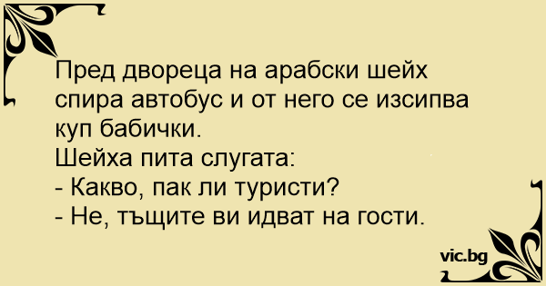 Prie arabų šeicho rūmų sustoja autobusas, pilnas pagyvenusių moteriškių. Šeichas klausia savo sekretoriaus: - Turistai? Sekretorius: - Ne. Čia jūsų uošvienės atvažiavo į svečius.