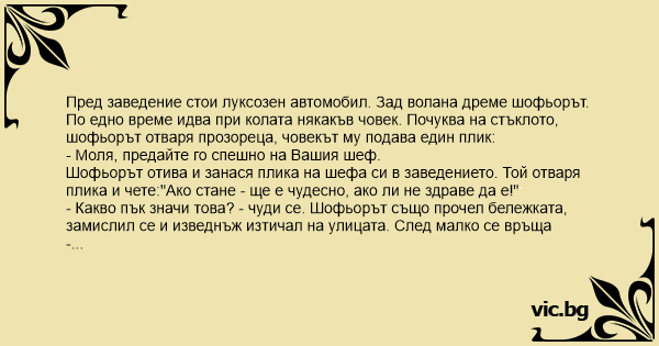 Шофьорът отива и занася плика на шефа си в заведението. Той отваря плика и чете:"Ако стане - ще е чудесно, ако ли не здраве да е!"