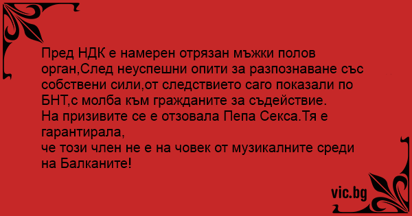 Пред НДК е намерен отрязан мъжки полов орган,След неуспешни опити за разпознаване със собствени сили,от следствието саго показали по БНТ,с молба към гражданите за съдействие.