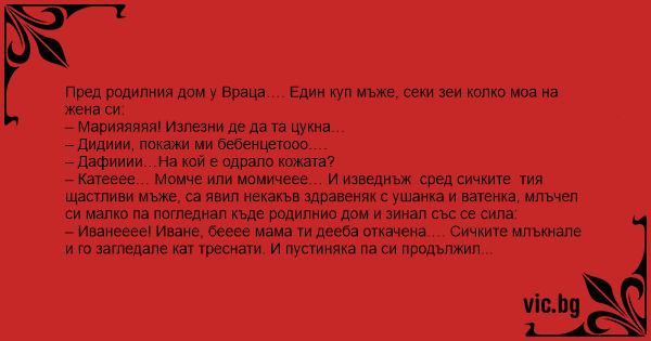– Катееее… Момче или момичеее… И изведнъж сред сичките тия щастливи мъже, са явил некакъв здравеняк с ушанка и ватенка, млъчел си малко па погледнал къде родилнио дом и зинал със се сила: