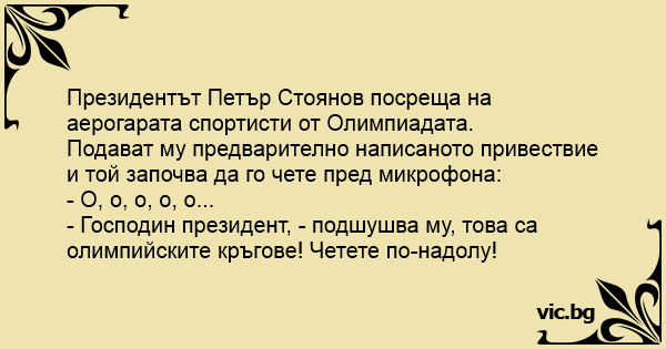 - Господин президент, - подшушва му, това са олимпийските кръгове! Четете по-надолу!