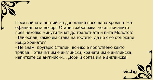 - Не знам, другарю Сталин, всичко е подготвено както трябва. Готвачът им е английски, храната им е английска, напитките са английски… Дори и солта им е английска!