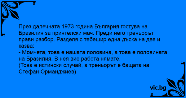 През далечната 1973 година България гостува на Бразилия за приятелски мач. Преди него треньорът прави разбор. Разделя с тебешир една дъска на две и казва: