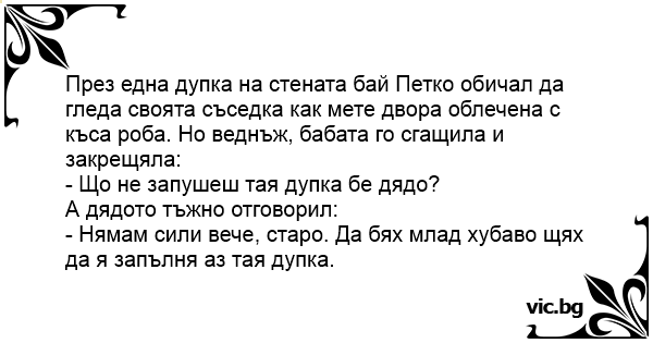 През една дупка на стената бай Петко обичал да гледа своята съседка как мете двора облечена с къса роба. Но веднъж, бабата го сгащила и закрещяла: