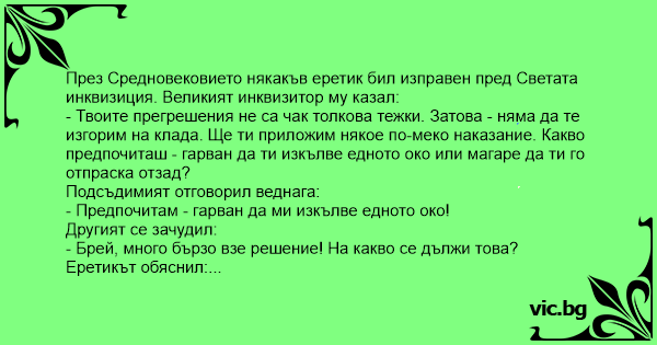 - Твоите прегрешения не са чак толкова тежки. Затова - няма да те изгорим на клада. Ще ти приложим някое по-меко наказание. Какво предпочиташ - гарван да ти изкълве едното око или магаре да ти го отпраска отзад?