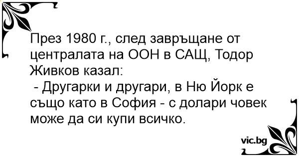 През 1980 г., след завръщане от централата на ООН в САЩ, Тодор Живков казал: