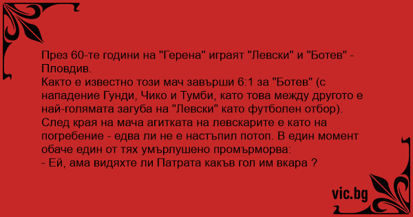 Както е известно този мач завърши 6:1 за "Ботев" (с нападение Гунди, Чико и Тумби, като това между другото е най-голямата загуба на "Левски" като футболен отбор). След края на мача агитката на левскарите е като на погребение - едва ли не е настъпил потоп. В един момент обаче един от тях умърлушено промърморва: