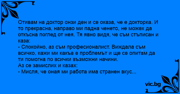 Отивам на доктор онзи ден и се оказа, че е докторка. И то прекрасна, направо ми падна ченето, не можех да откъсна поглед от нея. Тя явно видя, че съм стъписан и каза: