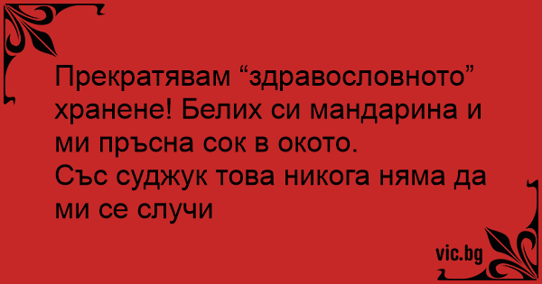 Прекратявам “здравословното” хранене! Белих си мандарина и ми пръсна сок в окото.