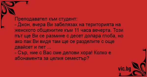 - Джон, вчера Ви забелязах на територията на женското общежитие към 11 часа вечерта. Този път ще Ви се размине с десет долара глоба, но ако пак Ви видя там ще се разделите с още двайсет и пет ...