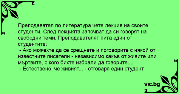 Преподавател по литература чете лекция на своите студенти. След лекцията започват да си говорят на свободни теми. Преподавателят пита един от студентите: