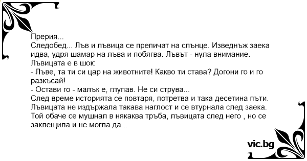 - Лъве, та ти си цар на животните! Какво ти става? Догони го и го разкъсай!