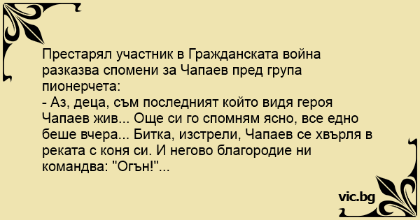 - Аз, деца, съм последният който видя героя Чапаев жив... Още си го спомням ясно, все едно беше вчера... Битка, изстрели, Чапаев се хвърля в реката с коня си. И негово благородие ни командва: "Огън!"...