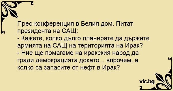 - Ние ще помагаме на иракския народ да гради демокрацията докато... впрочем, а колко са запасите от нефт в Ирак?
