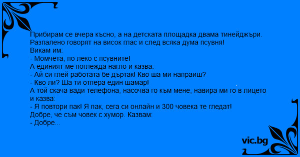 Прибирам се вчера късно, а на детската площадка двама тинейджъри. Разпалено говорят на висок глас и след всяка дума псувня!