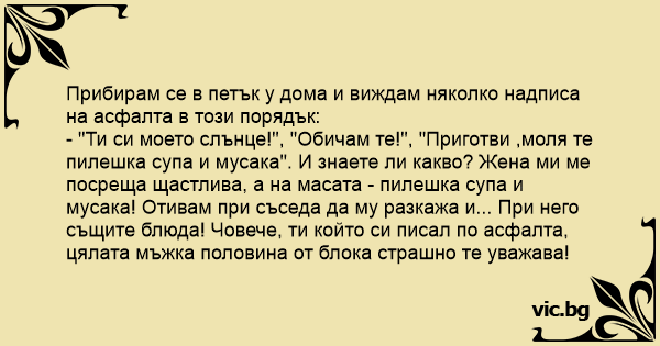 - "Ти си моето слънце!", "Обичам те!", "Приготви ,моля те пилешка супа и мусака". И знаете ли какво? Жена ми ме посреща щастлива, а на масата - пилешка супа и мусака! Отивам при съседа да му разкажа и... При него същите блюда! Човече, ти който си писал по асфалта, цялата мъжка половина от блока страшно те уважава!
