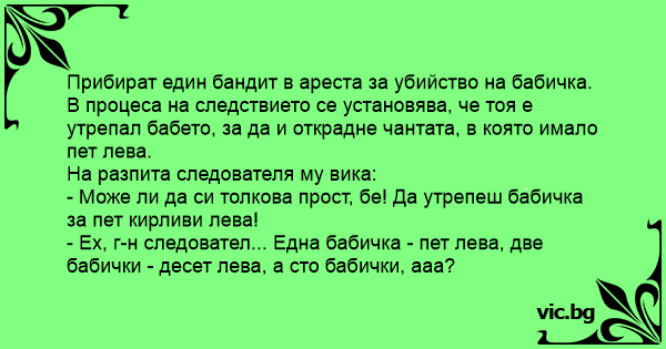 - Ех, г-н следовател... Една бабичка - пет лева, две бабички - десет лева, а сто бабички, ааа?