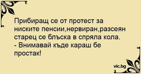 Прибиращ се от протест за ниските пенсии,нервиран,разсеян старец се блъска в спряла кола.