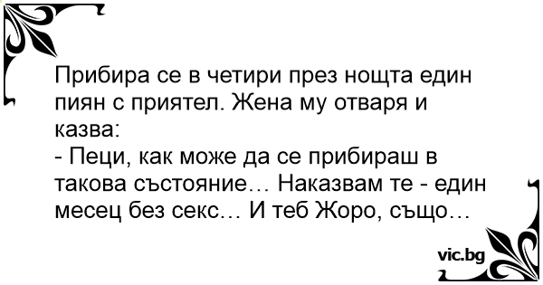 - Пеци, как може да се прибираш в такова състояние… Наказвам те - един месец без cekc… И теб Жоро, също…