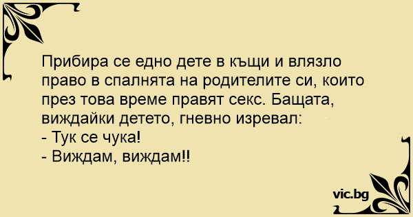 Прибира се едно дете в къщи и влязло право в спалнята на родителите си, които през това време правят cekc. Бащата, виждайки детето, гневно изревал: