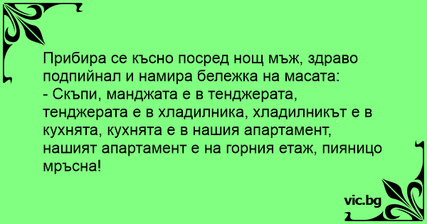 - Скъпи, манджата е в тенджерата, тенджерата е в хладилника, хладилникът е в кухнята, кухнята е в нашия апартамент, нашият апартамент е на горния етаж, пияницо мръсна!
