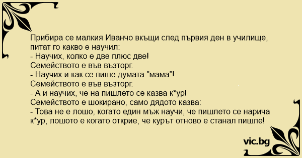 Прибира се малкия Иванчо вкъщи след първия ден в училище, питат го какво е научил: