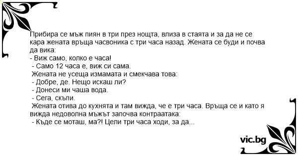 Прибира се мъж пиян в три през нощта, влиза в стаята и за да не се кара жената връща часвоника с три часа назад. Жената се буди и почва да вика: