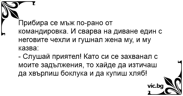 Прибира се мъж по-рано от командировка. И сварва на диване един с неговите чехли и гушнал жена му, и му казва: