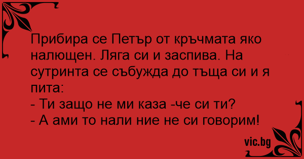 Прибира се Петър от кръчмата яко налющен. Ляга си и заспива. На сутринта се събужда до тъща си и я пита: