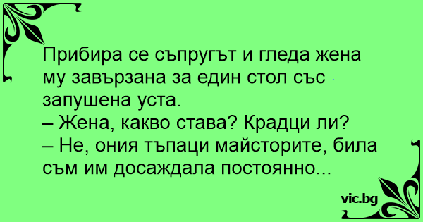 Се враќа Трпе од работа и ја гледа Трпана врзана за стол со селотејп залепен на устата. Бpry ја ослободил и ја прашува: - Крадци ли беа? - Не. Молерите. Им здосадило да им кажувам што да прават.