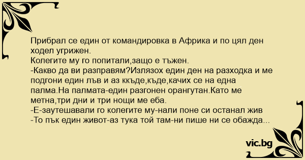 -Какво да ви разправям?Излязох един ден на разходка и ме подгони един лъв и аз ккъде,къде,качих се на една палма.На палмата-един разгонен орангутан.Като ме метна,три дни и три нощи ме eбa.