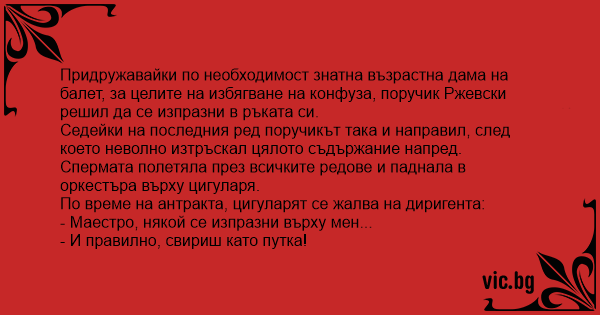 Придружавайки по необходимост знатна възрастна дама на балет, за целите на избягване на конфуза, поручик Ржевски решил да се изпpaзни в ръката си.