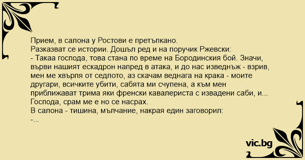 - Такаа господа, това стана по време на Бородинския бой. Значи, върви нашият ескадрон напред в атака, и до нас изведнъж - взрив, мен ме хвърля от седлото, аз скачам веднага на крака - моите другари, всичките убити, сабята ми счупена, а към мен приближават трима яки френски кавалериста с извадени саби, и...