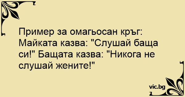 Пример за омагьосан кръг: Майката казва: "Слушай баща си!" Бащата казва: "Никога не слушай жените!"