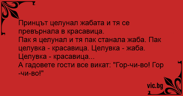 Пак я целунал и тя пак станала жаба. Пак целувка - красавица. Целувка - жаба. Целувка - красавица...